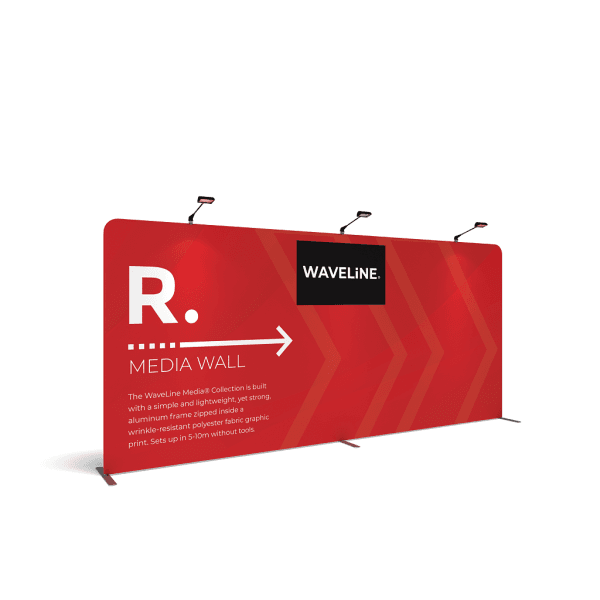This 5mW x 2.3mH WaveLine Tension-Fabric Backdrop is built with a simple and lightweight, yet strong, aluminum frame with a pillow case-style, wrinkle-resistant polyester fabric graphic panel which zips over the frame to create tension and remove creases.
