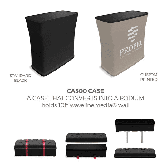 Made from 2 Fabric Backdrops connected together, this 2.9mW x 2.45mH backdrop includes 1 Shipping Case-to-Table conversion kit with an LCD Bracket for a small monitor.